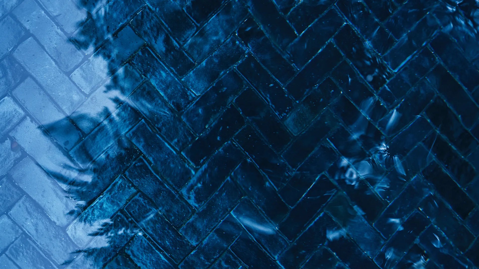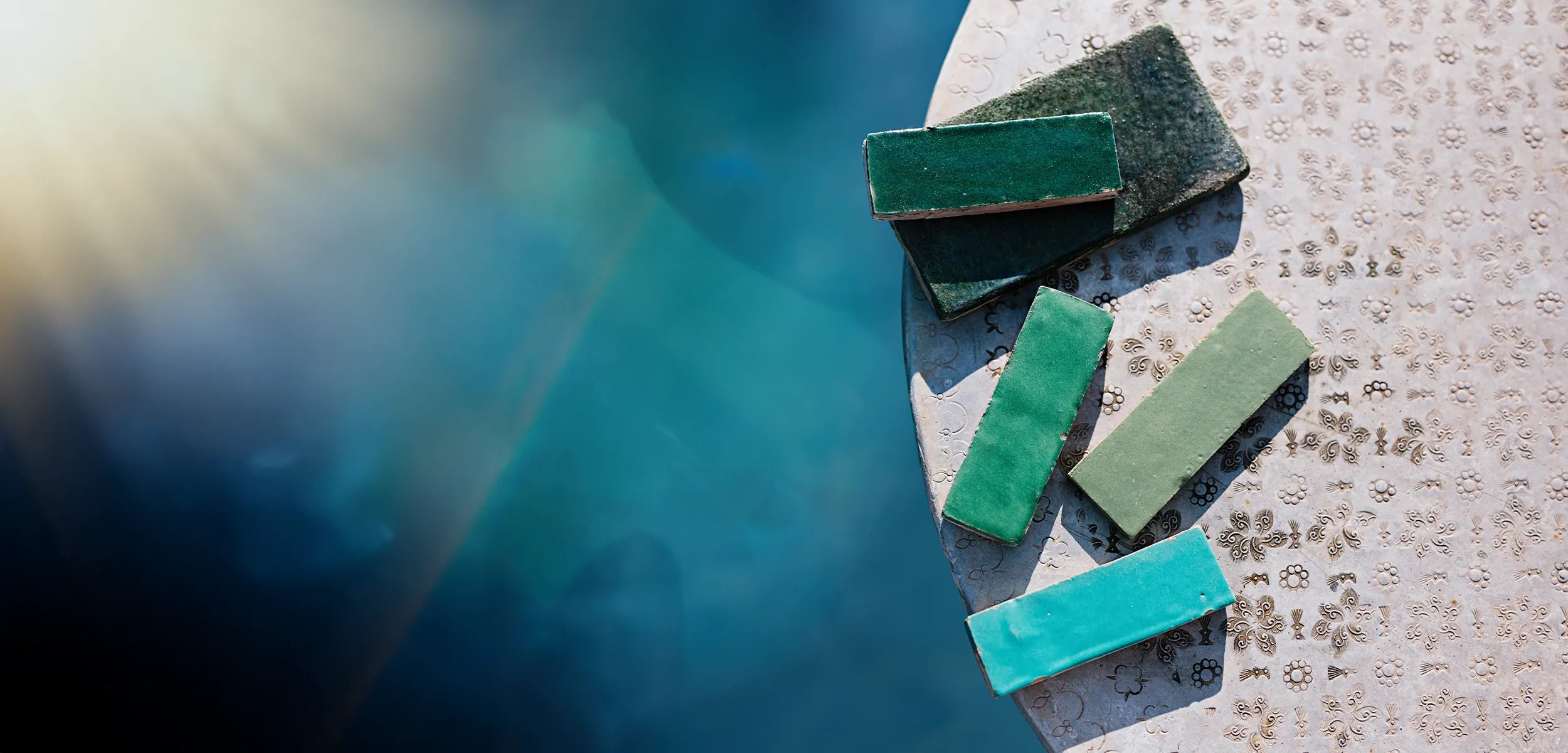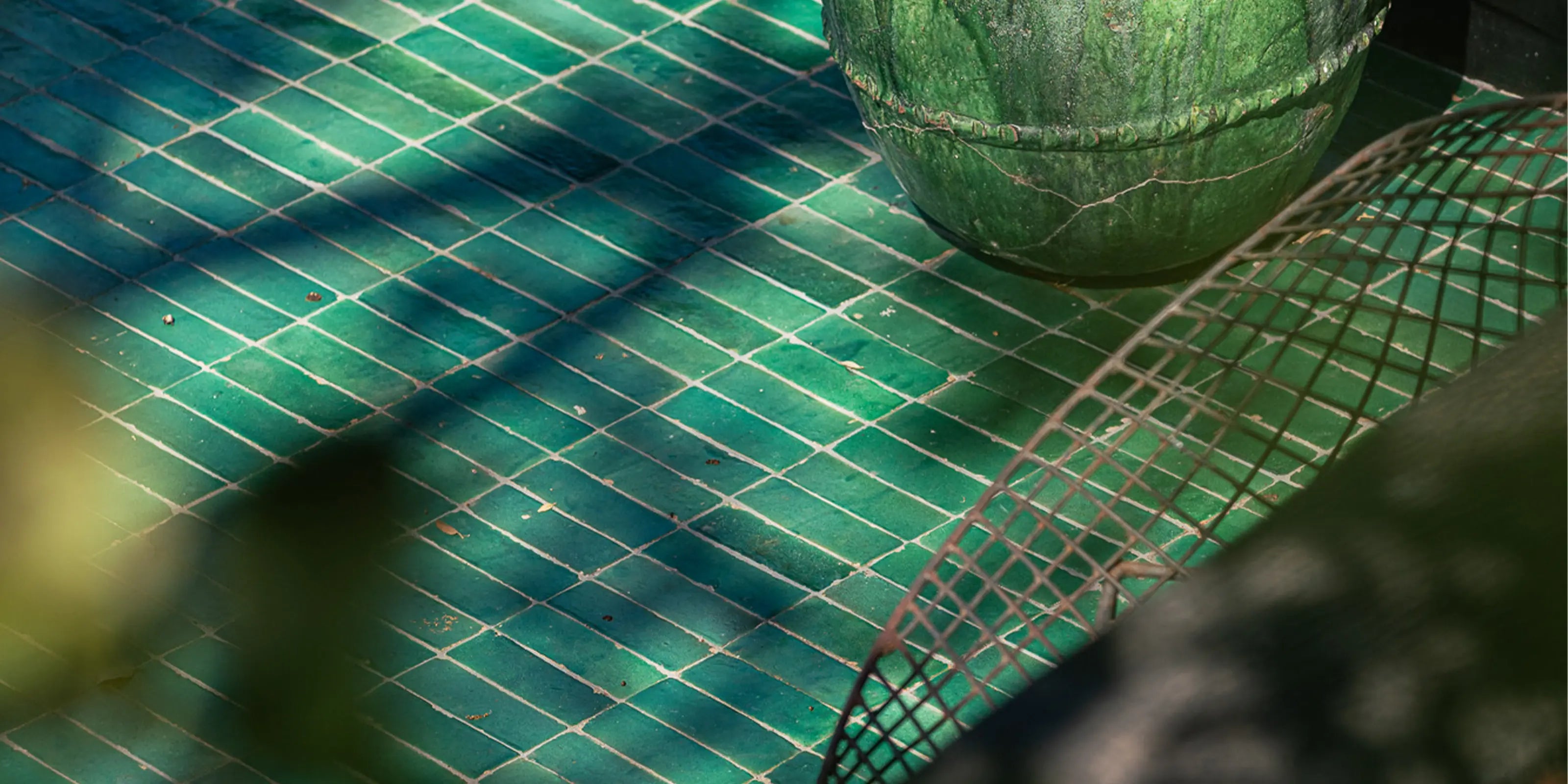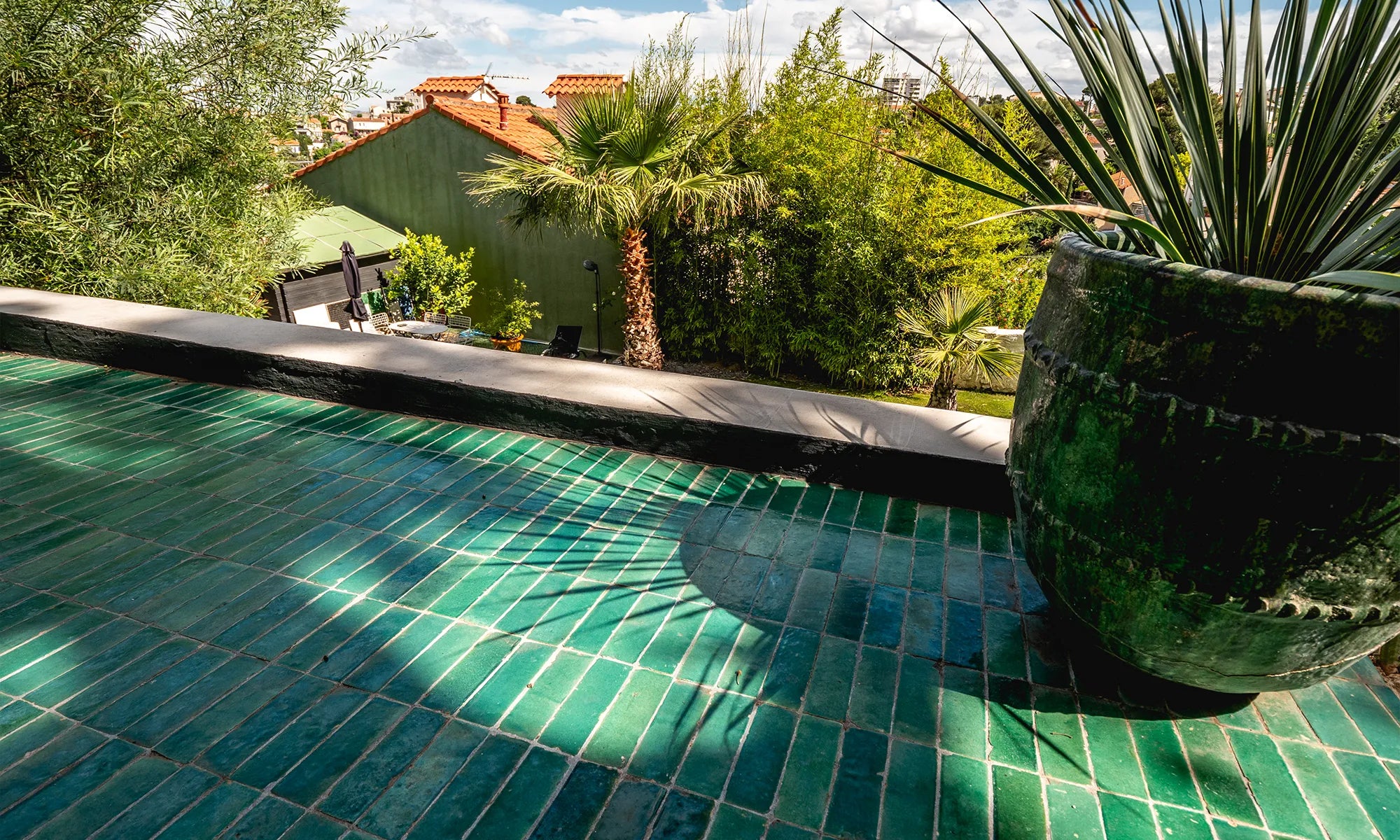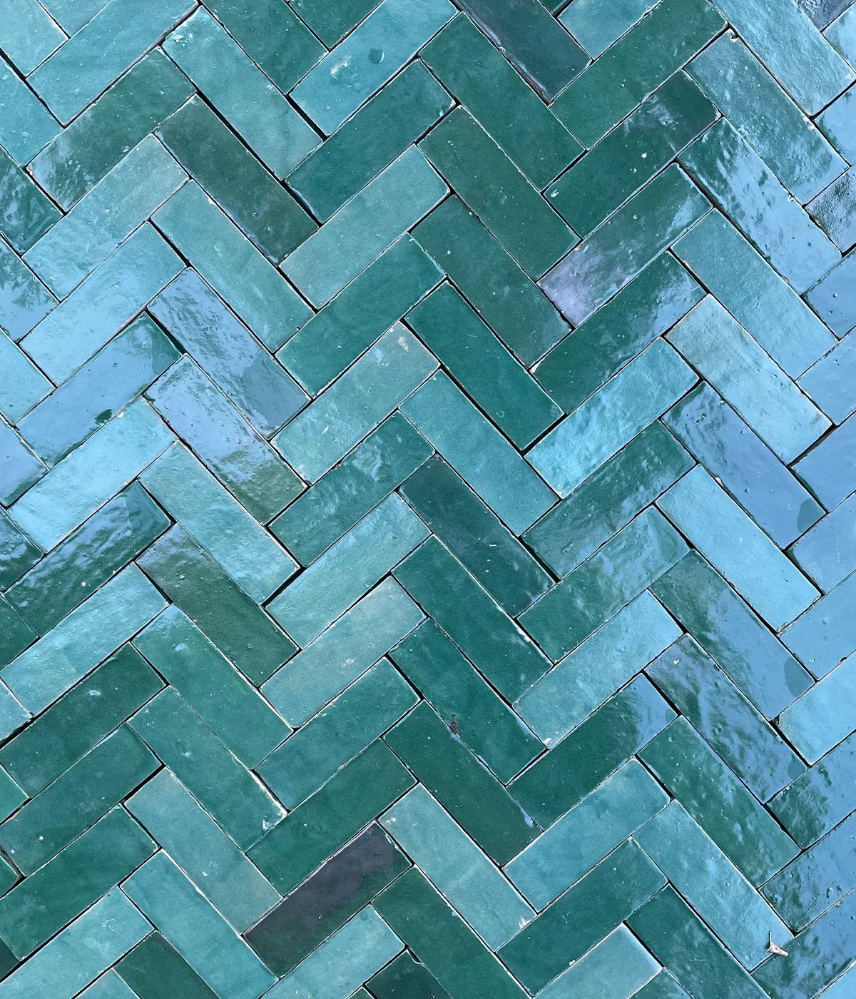 Ces Bejmats naviguent entre les bleus et verts turquoise et nous ont été inspirés par le musée Yves Saint Laurent de Marrakech et ses murs en céramique. Nous les avons posés de façon droite sur le sol de notre rooftop (bandeau du haut) tandis qu'une pose en chevron a été choisie pour orner ces deux piscines.