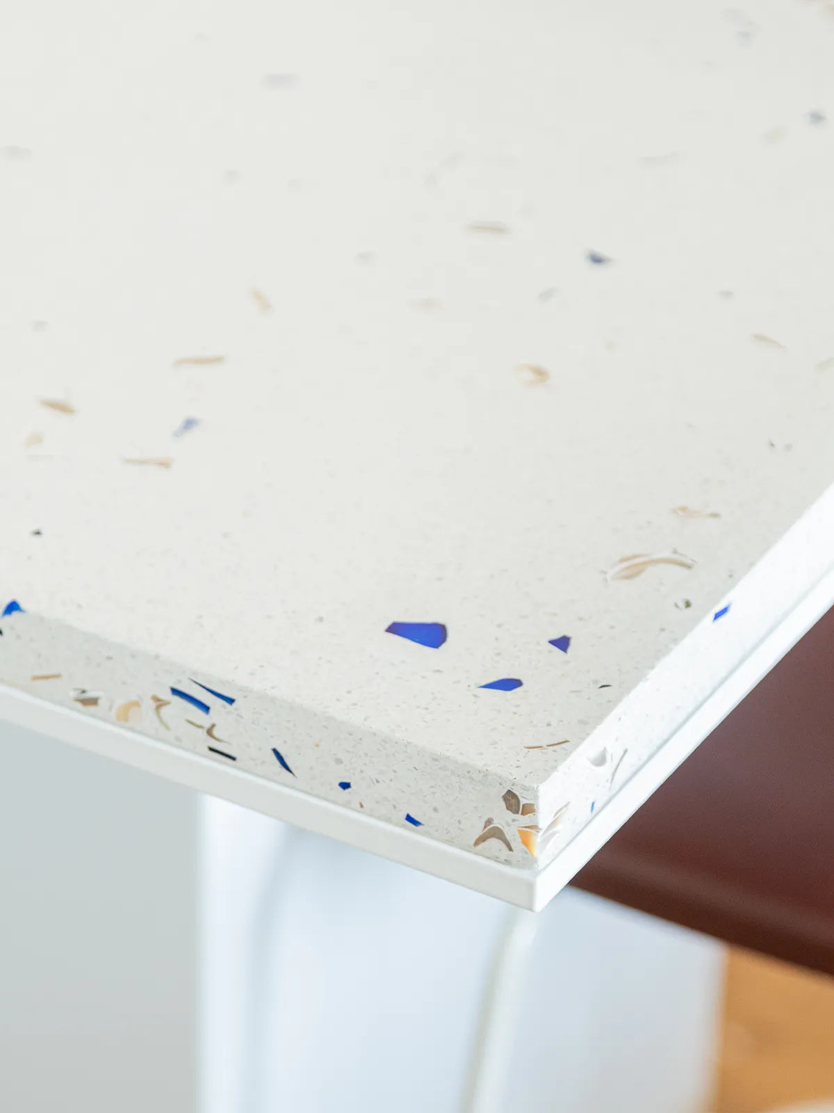 Nous vous présentons une de nos dernières créations, installée dans un appartement du Centre-Ville Marseillais : un plan de travail en Terrazzo de 6,5 mètres de longueur en "L" d'un superbe Rouge de Vénétie. Fait notable, ce Terrazzo d'un seul tenant, sans jointure apparente est d'une épaisseur exceptionnelle : 5 cm. Néanmoins, grâce à un procédé innovant développé par le Jardin Des Matières au fil des réalisations, ce plan de travail affiche un poids raisonnable, autorisant manutention et installation sereines par nos équipes.